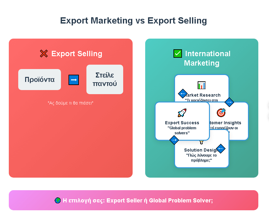 Όταν πουλάς στη γειτονιά, μπορεί να τη “βγάλεις” με aggressive selling. Στο εξωτερικό χρειάζεσαι πραγματικό export marketing strategy.